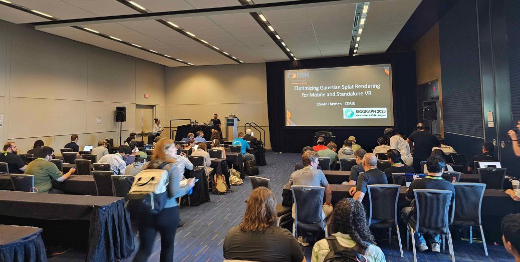 Au SIGGRAPH 2025, l’atelier Optimizing Real-Time Gaussian Splat Rendering for Mobile and Standalone VR donné par Olivier Therrien, programmeur-chercheur en rendu du CDRIN et présenté dans le cadre du programme Labs, a fait salle comble.